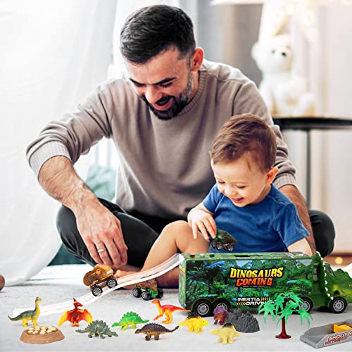 Aoskie Dinosaur Toys for Kids 3-7, Transporter Truck with Roar Sound & Lights, 3 Pull Back Cars, 12 Dinosaurs (23Pcs)