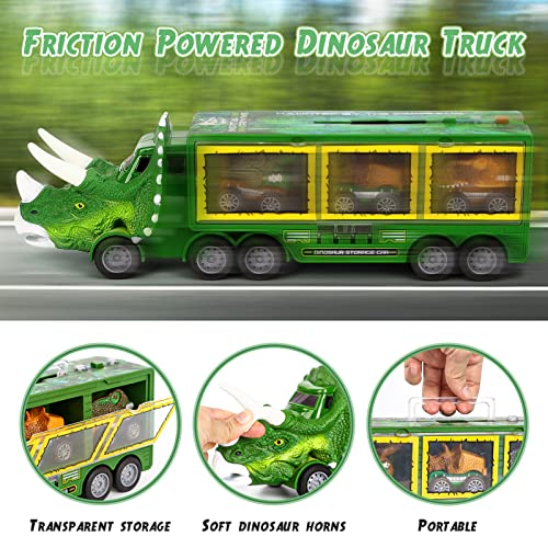 【Portable and Multifunctional】The dinosaur toys are made of durable plastic and soft dinosaur horns. You can storage 3 dinosaur cars in the truck and carry it everywhere.