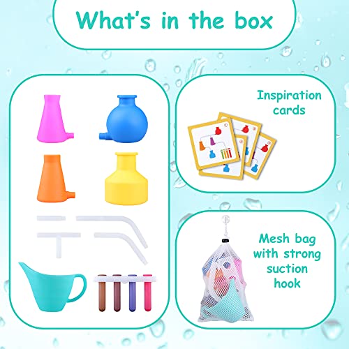 🧼【Educational Bath Toy】 The baby bath toys set includes silicone container and test tubes. With a powerful suction cup specially designed for the shower wall, children can easily fix it on the bathroom wall or in the bathtub and easily combine them into any combination. These toddler bath toys can stimulate your child’s brain imagination and design their labs like a scientist. It can also exercise the coordination ability of hands and eyes!