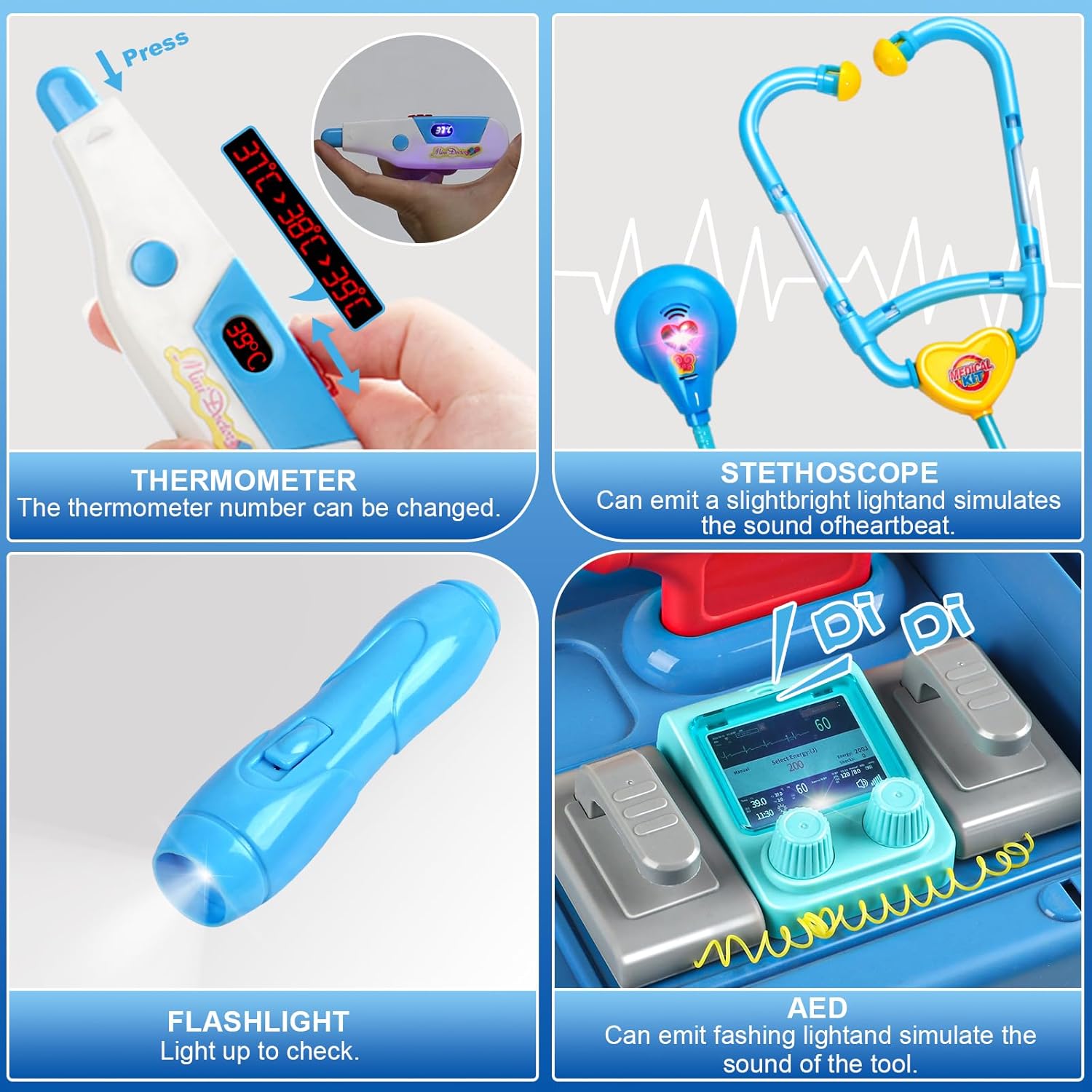 PRETEND PLAY TODDLER TOYS: Kids can put on a doctor’s jacket and hat,pretend play doctor to treat family members and friends. When toddler press the stethoscope, they can hear the real heartbeat. Defibrillator, flashlight, thermometer, and otoscope can all light up while working, boys girls toys 4-5 giving little one a more realistic role paly experience.