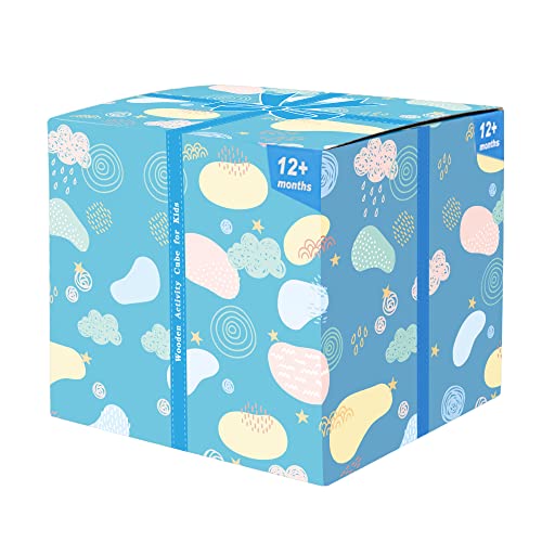 🎁【BABY FRIENDLY】The activity cube toys are made of natural solid wood with polished edges and water-based paint. The blocks are sized for little hands and big enough to prevent choking hazard. The well-made cube with beautiful patterns is popular with kids and provides an engaging option for playing.
