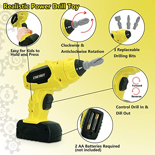 Realistic Toy Tools with Kids Tool Belt & Vest for a More Authentic Experience: This kids construction toys comes with kids power drill toy which makes simulated sounds and spins.(2 AA batteries required.) Dressing up with toddler tool belt, builder dress up and cool goggles, you little boys will busy drilling and hammering everything around the house without hurting themselves or damaging anything.
