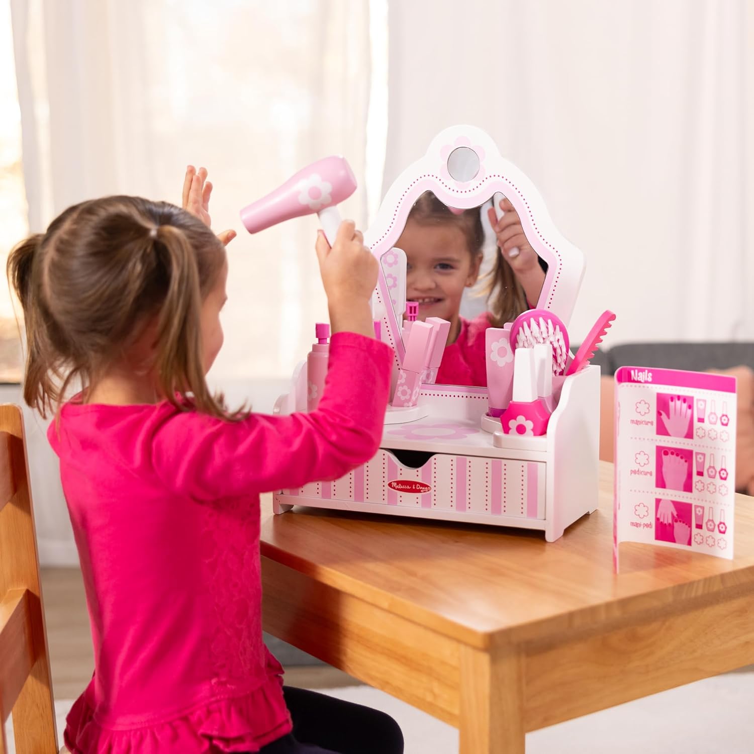 Add glamour and style to playtime with these wooden beauty essentials for make-believe makeovers! The 18-piece set includes a sturdy white and pink vanity with mirror and storage drawer. The wooden pieces include a hair dryer, hair spray, hair straightener, flip-top lotion bottle, lipstick, two nail polish bottles, blush, makeup brush, eye shadow and applicator, comb, and brush. A reusable spa services card lets kids three and older get the full salon experience by customizing makeovers for themselves, friends, stuffed animals, and dolls! This product is certified by the Forest Stewardship Council. FSC certification ensures that products come from responsibly managed forests that provide environmental, social, and economic benefits, and that forests are protected for future generations. Please note that FSC certification applies to new inventory only (FSC C156584)