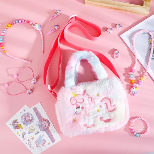 Quality Material: The unicorn handbag for girls are made of plush material, soft and comfortable, smooth and textured, and girls dress up jewellery set is made of plastic and resin, which is easy to wear, a full unicorn jewelry for girls can match with your kids outfits well
