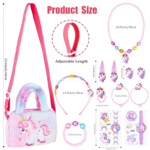 Package Includes: You will receive 1pcs plush unicorn handbag, 1 pcs unicorn beaded necklace, 1 pcs unicorn bracelet, 1pcs rings , 2 pcs earring, 1pcs unicorn headbands for girls, 2pcs hairpin , 2 pcs hair rope and 2 pcs stickers all featuring colorful and cute unicorn designs. unicorn crossbody bag with jewelry set ideal for little girls who age 3-8 and love unicorns, and want to add some fun to their outfits